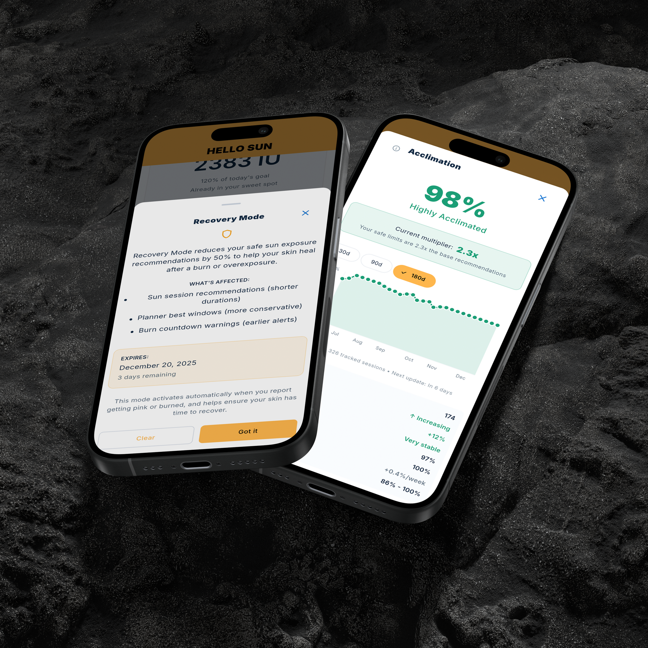 Hello Sun learns your real-world tolerance and adjusts your safe limits over time—and if you mark a burn, it automatically switches into a temporary “be extra gentle” recovery mode with shorter, safer recommendations while you bounce back.